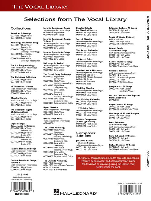 14 Sacred Solos The Vocal Library High Voice Publisher: Hal Leonard Category: Vocal Series: Vocal Collection Format: Softcover Audio Online This useful, inventive collection of sacred solos is a valuable resource for classical singers looking for...Regular price $21.99 -