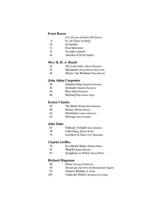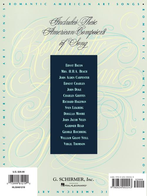Romantic American Art SongsHigh VoicePublisher: G. Schirmer, Inc.Category: ClassicalSeries: Vocal CollectionFormat: Paperback50 songs by 14 composers. Songs date from before World War I to about the 1950's. All songs in the original key. Contents: Bacon: Five...Regular price $39.99 -