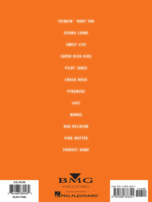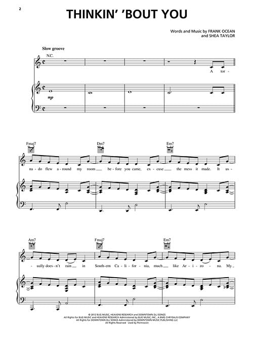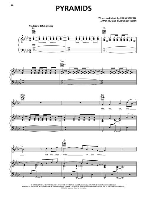 Frank Ocean - Channel OrangePublisher: Hal LeonardCategory: Keyboard & Piano/Vocal/GuitarSeries: Piano/Vocal/Guitar Artist SongbookFormat: SoftcoverAll 12 tracks off the Grammy Award-winning studio debut from this R&B superstar. Includes the hit single Thinkin' 'Bout You and: Bad Religion...Regular price $29.99 -