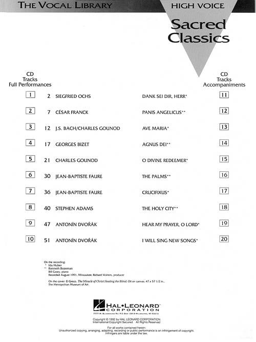Sacred ClassicsThe Vocal Library High VoicePublisher: Hal LeonardCategory: VocalSeries: Vocal CollectionFormat: Softcover Audio OnlineAn eminently useful collection of essential sacred favorites for classical singers. Includes online audio access with both full performances and piano accompaniments only...Regular price $21.99