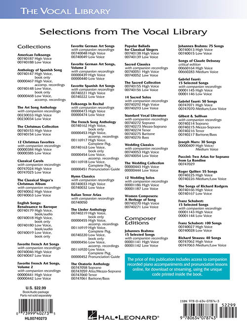 Standard Vocal Literature - An Introduction to RepertoireMezzo-SopranoPublisher: Hal LeonardCategory: VocalSeries: Vocal CollectionFormat: Softcover Audio OnlineThis series of five book/online audio access packs is an introduction to art song in English, French, German, Italian and Spanish....Regular price $29.99 -