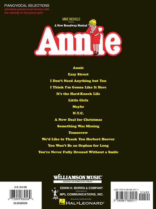 Composer: Charles StrouseAnniePublisher: Hal LeonardCategory: Keyboard & Piano/Vocal/GuitarSeries: Vocal SelectionsFormat: Paperback14 songs from the beloved children's musical, featuring: Annie · Easy Street · It's the Hard-Knock Life · A New Deal for Christmas · Tomorrow ·...Regular price $27.99 -
