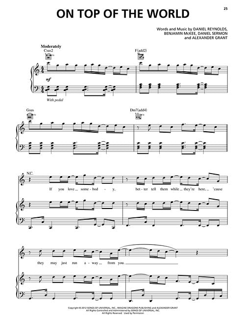 Imagine Dragons - Night VisionsPublisher: Hal LeonardCategory: Keyboard & Piano/Vocal/GuitarSeries: Piano/Vocal/Guitar Artist SongbookFormat: SoftcoverThe 2012 debut album by these Las Vegas indie rockers peaked atop the Billboard Alternative Albums chart and was named one of that...Regular price $29.99
