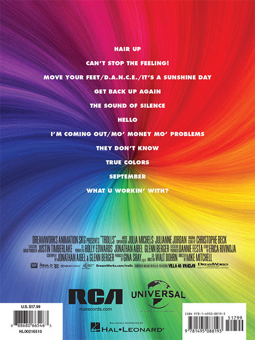 TrollsMusic from the Motion Picture SoundtrackPublisher: Hal LeonardCategory: Keyboard & Piano/Vocal/GuitarSeries: Piano/Vocal/Guitar SongbookFormat: SoftcoverMatching folio to the infectious soundtrack of the 2016 DreamWorks film featuring songs by Justin Timberlake; Anna Kendrick; Zooey Deschanel; Gwen Stefani; Ariana...Regular price $27.99 -