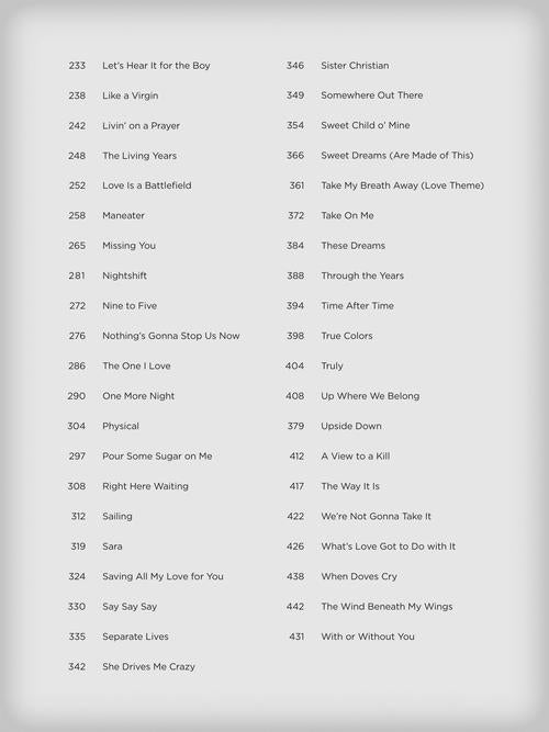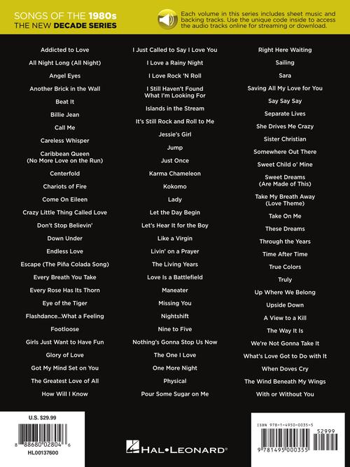 Songs of the 1980sThe New Decade Series with Online Play-Along Backing TracksPublisher: Hal LeonardCategory: Keyboard & Piano/Vocal/GuitarSeries: Piano/Vocal/Guitar SongbookFormat: Softcover Audio OnlineThis songbook doubles as a time capsule, preserving over 80 of the '80s best arranged...Regular price $47.99 -