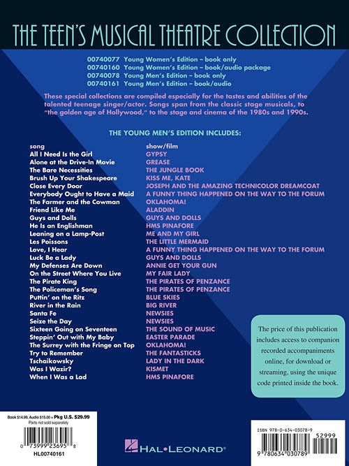 The Teen's Musical Theatre CollectionYoung Men's EditionPublisher: Hal LeonardCategory: VocalSeries: Vocal CollectionFormat: Softcover Audio OnlineThis publication is a hit! With almost 30 great songs in each volume from the stage and movie musicals, it has become...Regular price $39.99 -