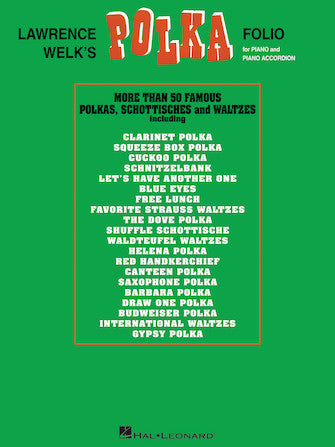 Lawrence Welk's Polka FolioPublisher: Hal LeonardCategory: Keyboard & Piano/Vocal/GuitarSeries: Piano/Vocal/Guitar SongbookFormat: PaperbackMore than 50 famous polkas, schottisches and waltzes arranged for piano and accordion, including: Barbara Polka · Blue Eyes · Budweiser Polka · Canteen Polka...Regular price $20.99