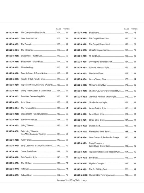 Expand your keyboard knowledge with the Keyboard Lesson Goldmine series! The series contains four books: Blues, Country, Jazz, and Rock. Each volume features 100 individual modules that cover a giant array of topics. Each lesson includes detailed instructions with playing examples. You'll also get extremely useful tips and more to reinforce your learning experience, plus access to online audio featuring performance demos of all the examples in the book! 100 Blues Lessons includes 12-bar blues, 8-bar blues, 16-bar blues; right-hand fills, left-hand patterns; stylings of the great blues pianists; chord voicings; dominant 7th chords, dominant 9th chords; and much more! The audio is accessed online using the unique code inside each book and can be streamed or downloaded. The audio files include PLAYBACK+, a multi-functional audio player that allows you to slow down audio without changing pitch, set loop points, change keys, and pan left or right.