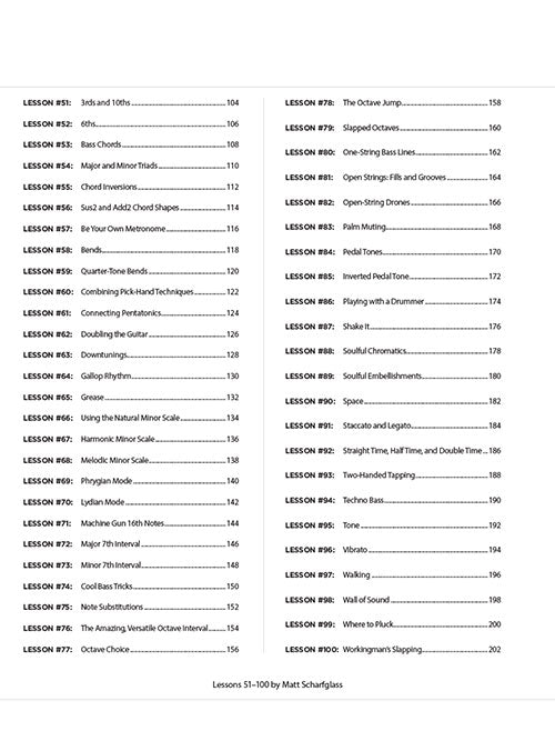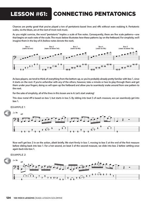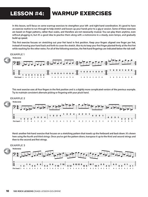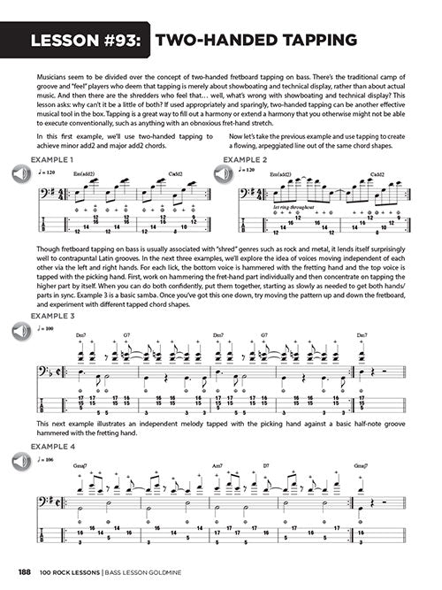 Expand your bass knowledge with the Bass Lesson Goldmine series! Featuring 100 individual modules covering a giant array of topics, each lesson in this Rock volume includes detailed instruction with playing examples presented in standard notation and tablature. You'll also get extremely useful tips, scale diagrams, chord grids, photos, and more to reinforce your learning experience plus online performance demos of all the examples in the book! This volume covers a huge variety of rock bass styles, techniques, and concepts including: first position notes; basic fingerstyle; basic slapping; fingerstyle rakes; drop D tuning; memorizing the fretboard; arpeggios; harmonics; Paul McCartney style; John Entwistle style; Geddy Lee style; Billy Sheehan style; Flea style; gallop rhythm; tapping; techno bass; walking; where to pluck; and much more! Audio is accessed online using the unique code inside the book and can be streamed or downloaded. The audio files include PLAYBACK+, a multi-functional audio player that allows you to slow down audio without changing pitch, set loop points, change keys, and pan left or right.