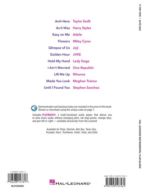Now instrumentalists can play-along with some of today's top hits! These songbooks feature solo instrumental arrangements with professionally-recorded demonstration and backing tracks so after a little bit of practice, you can sound like you're playing with the band! Songs include: Anti-Hero (Taylor Swift) · As It Was (Harry Styles) · Easy on Me (Adele) · Flowers (Miley Cyrus) · Glimpse of Us (Joji) · Golden Hour (JVKE) · Hold My Hand (Lady Gaga) · I Ain't Worried (One Republic) · Lift Me Up (Rihanna) · Made You Look (Megan Trainor) · Until I Found You (Stephen Sanchez). Audio is accessed online using the unique code inside the book and can be streamed or downloaded. The audio files include PLAYBACK+, a multi-functional audio player that allows you to slow down audio without changing pitch, set loop points, change keys, and pan left or right.