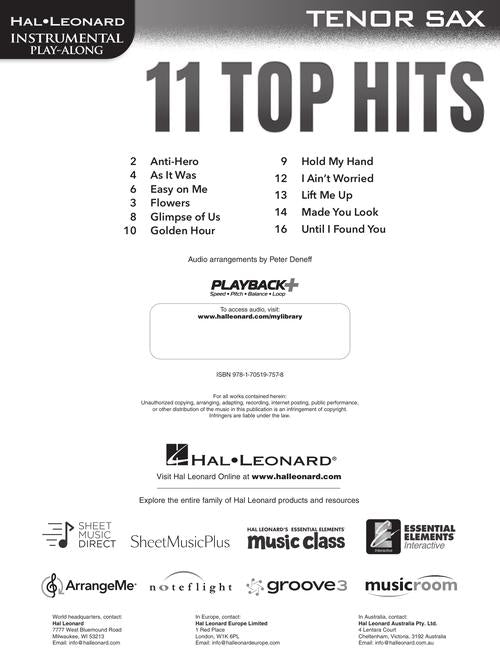 Now instrumentalists can play-along with some of today's top hits! These songbooks feature solo instrumental arrangements with professionally-recorded demonstration and backing tracks so after a little bit of practice, you can sound like you're playing with the band! Songs include: Anti-Hero (Taylor Swift) · As It Was (Harry Styles) · Easy on Me (Adele) · Flowers (Miley Cyrus) · Glimpse of Us (Joji) · Golden Hour (JVKE) · Hold My Hand (Lady Gaga) · I Ain't Worried (One Republic) · Lift Me Up (Rihanna) · Made You Look (Megan Trainor) · Until I Found You (Stephen Sanchez). Audio is accessed online using the unique code inside the book and can be streamed or downloaded. The audio files include PLAYBACK+, a multi-functional audio player that allows you to slow down audio without changing pitch, set loop points, change keys, and pan left or right.