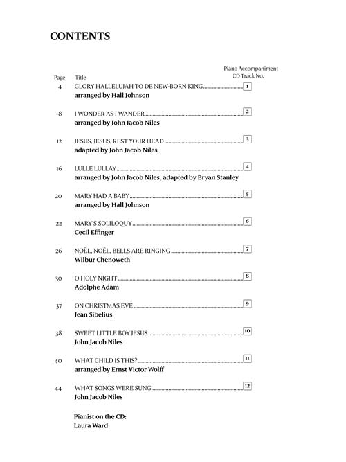 Selection of art songs and spirituals that are appropriate for classical singers. Suitable for performances in church or recital. Contents: Glory Hallelujah to de New-Born King (Johnson) · I Wonder as I Wander (Niles) · Jesus, Jesus, Rest Your Head (Niles) · Lulle Lullay (Niles) · Mary Had a Baby (Johnson) · Mary's Soliloquy (Effinger) · Noel, Noel, Bells are Ringing (Chenoweth) · O Holy Night (Adam) · On Christmas Eve (Sibelius) · Sweet Little Boy Jesus (Niles) · What Child is This? (EV Wolf) · What Songs were Sung (Niles)
