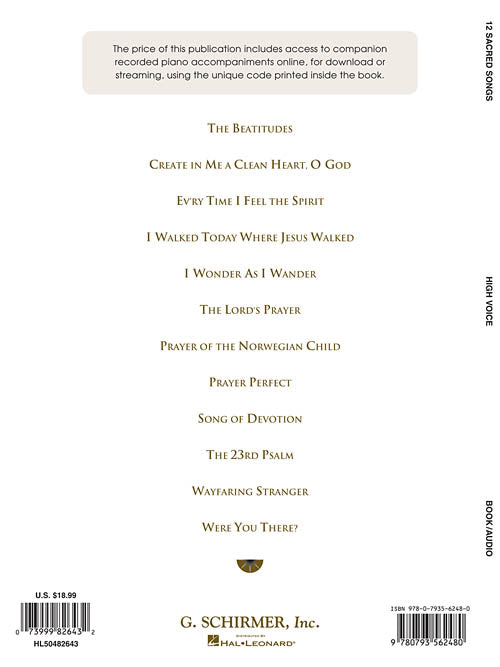 Includes access to recorded accompaniments online. Contents: The Lord's Prayer (Malotte) · The 23rd Psalm (Malotte) · The Beatitudes (Malotte) · Prayer of the Norwegian Child (Kountz) · Song of Devotion (Beck) · I Wonder As I Wander (Niles) · Wayfaring Stranger (Kountz) · Were You There (arr. Johnson) · Ev'ry Time I Feel the Spirit (arr. Johnson) · Prayer Perfect (Speaks) · Create in me a clean heart, O God (Mueller) · I Walked Today Where Jesus Walked (O'Hara).