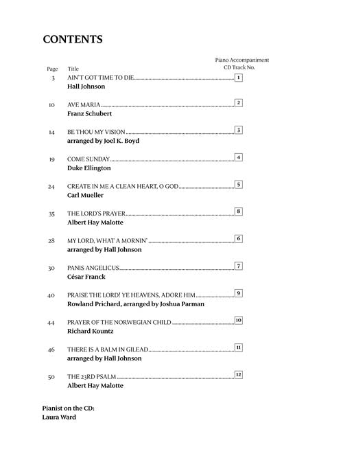 Selection of sacred songs and spirituals that are appropriate for classical singers. Suitable for performances in church or recital. Contents: Ain't Got Time to Die (Johnson) · Ave Maria (Schubert) · Be Thou my Vision (Boyd) · Come Sunday (ELLINGTON) · Create in me a Clean Heart, O god (Mueller) · The Lord's Prayer (Malotte) · My Lord, What a Mornin' (Johnson) · Panis Angelicus (Franck) · Praise the Lord! Ye Heavens, Adore Him (Prichard) · Prayer of the Norwegian Child (Kountz) · There is a Balm in Gilead (Johnson) · The 23rd Psalm (Malotte)