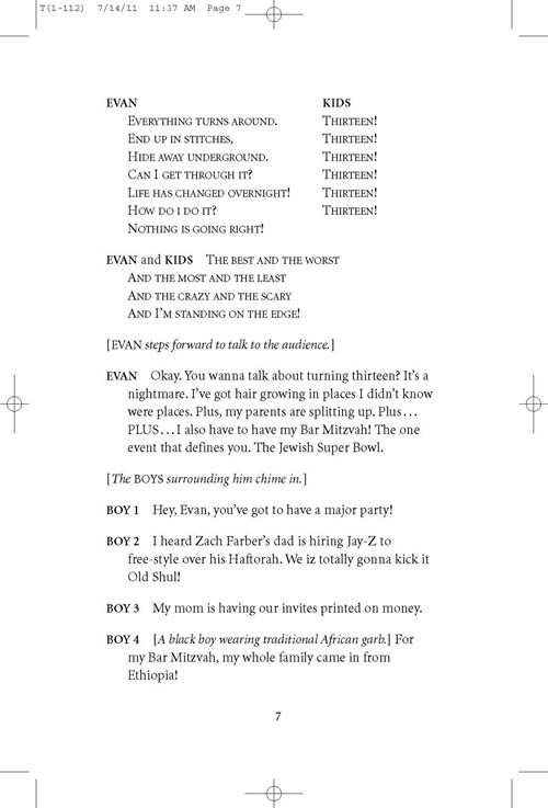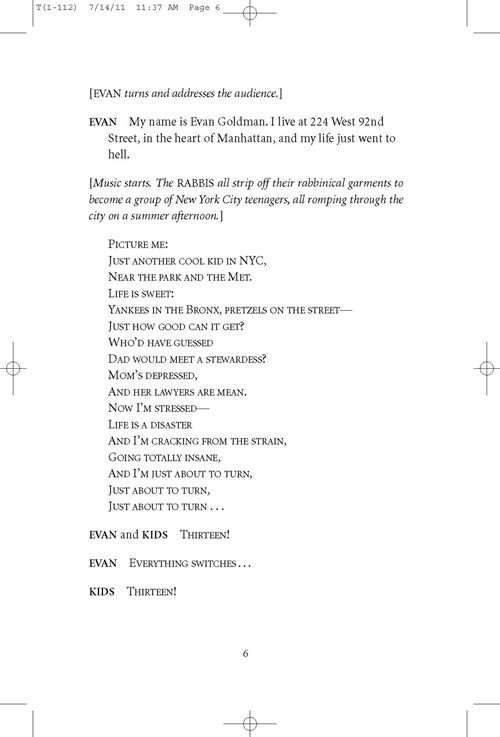 One of the most frequently produced new musicals of the last decade, 13 is a rollicking musical comedy featuring a cast exclusively made up of teenagers. Thirteen 13-year-olds, as a matter of fact. Evan Goldman is two months from turning 13 years old, living happily in New York City, the greatest city on Earth, when his world is blown apart by his parents' divorce, and he is dragged away from home to live with his mother in a small town in the Midwest. Facing a new life in a new place where the customs and culture are utterly alien to him, and with his bar mitzvah getting closer every day, Evan has to navigate who he wants to be versus who he really is, and see if he can make it through the fall without losing the best friends he'll ever have. Check out the Closer Look feature on www.halleonard.com to view a video promotion for this book!