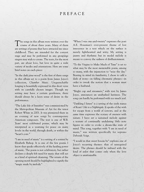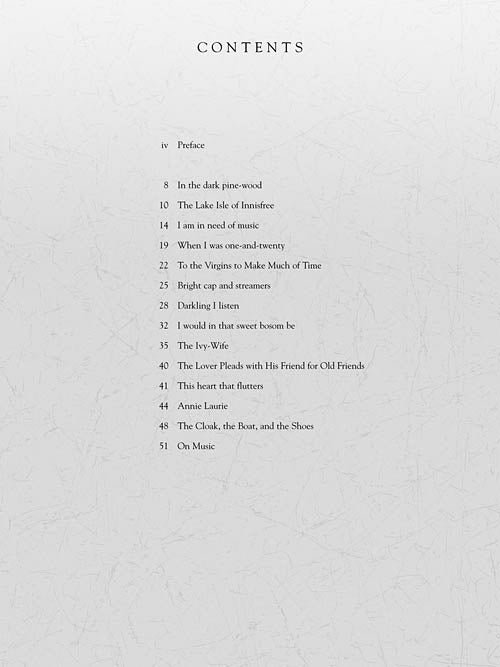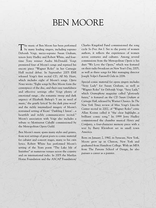 Ben Moore (b. 1960) writes lovely, lyric songs that are gratifying to perform. Many of the songs in this collection were recorded by Deborah Voigt and Brian Zeger on the recently released All My Heart: Deborah Voigt Sings American Songs. Includes commentary from the composer about each song. Contents: In the dark pine-wood · The Lake Isle of Innisfree · I am in need of music · When I was one-and-twenty · To the Virgins to Make Much of Time · Bright cap and streamers · Darkling I listen · I would in that sweet bosom be · The Ivy-Wife · The Lover Pleads with His Friend for Old Friends · This heart that flutters · Annie Laurie · The Cloak, the Boat, and the Shoes · On Music