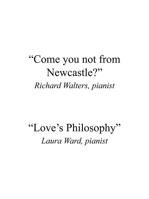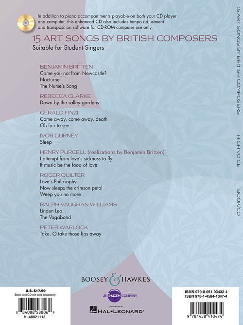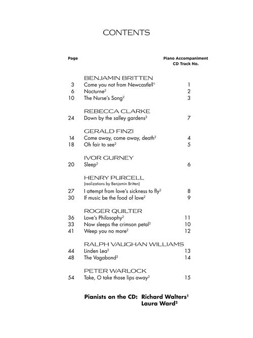 This collection, representing major composers, was compiled as an introduction to British song literature for collegiate age singers and advanced high school age singers. Britten: Come you not from Newcastle? · Britten: Nocturne · Britten: The Nurse's Song · Clarke: Down by the Salley Gardens · Finzi: Come away, come away, death · Finzi: Oh fair to see · Gurney: Sleep · Purcell/Britten: I attempt from love's sickness to fly · Purcell/Britten: If music be the food of love (1st version) · Quilter: Love's Philosophy · Quilter: Now sleeps the crimson petal · Quilter: Weep you no more · Vaughan Williams: Linden Lea · Vaughan Williams: The Vagabond · Warlock: Take o take those lips away.
