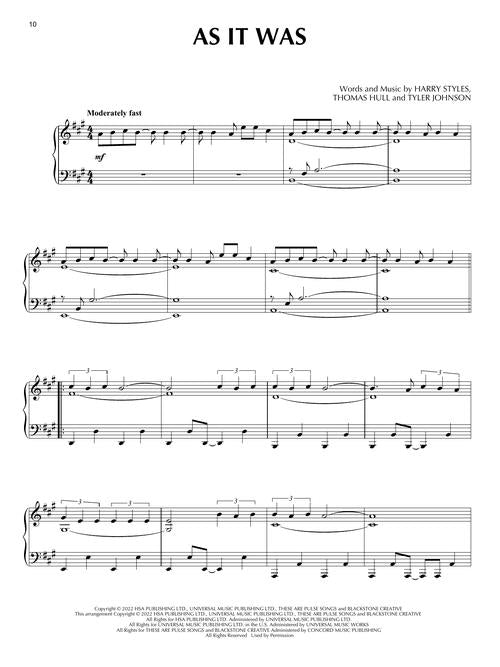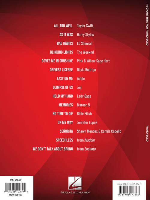 This folio features fifteen full-sounding piano solo arrangements of recent chart hits, including: All Too Well (Taylor Swift) · As It Was (Harry Styles) · Bad Habits (Ed Sheeran) · Blinding Lights (The Weeknd) · Drivers License (Olivia Rodrigo) · Easy on Me (Adele) · Glimpse of Us (Joji) · We Don't Talk About Bruno (from Encanto) · and more.