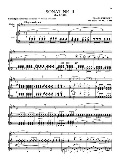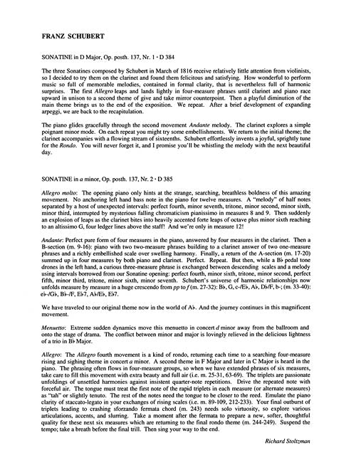These two Sonatines composed by Schubert in March of 1816 receive relatively little attention from violinists, Richard Stoltzman thankfully decided to transcribe them for the clarinet. The felicitous and satisfying quality of the works is perfect for the clarinet as they are full of memorable melodies contained in a formal claity, that is nevertheless full of harmonic surprises. This edition includes a CD recording of Richard Stoltzman and the pianist Richard Goode performing them. This is a world premiere edition never before published. Richard Stoltzman has created practical and enjoyable versions of these Sonatines for clarinet and piano...Schubert's typical beauty of melody and balance of form combine for satisfying recital or recreational works.--The Clarinet