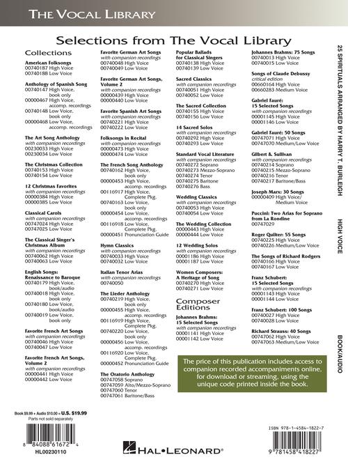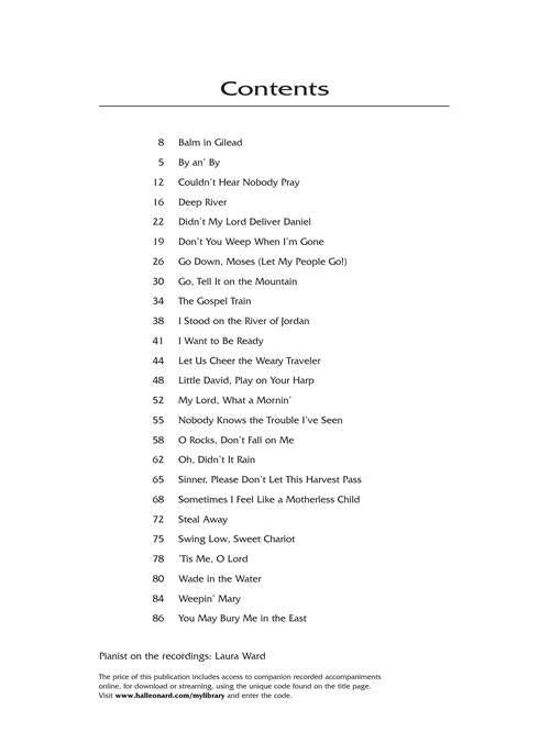 One of the classic arrangers of spirituals, the timeless work of Harry T. Burleigh (1866-1949) lives on in this newly engraved collection. Contents: Balm in Gilead · By an' By · Couldn't Hear Nobody Pray · Deep River · Didn't My Lord Deliver Daniel · Don't You Weep When I'm Gone · Go Down, Moses (Let My People Go!) · Go, Tell It on the Mountain · The Gospel Train · I Stood on the River of Jordan · I Want to Be Ready · Let Us Cheer the Weary Traveler · Little David, Play on Your Harp · My Lord, What a Mournin', Nobody Knows the Trouble I've Seen · O Rocks, Don't Fall on Me · Oh, Didn't It Rain · Sinner, Please Don't Let This Harvest Pass · Sometimes I Feel Like a Motherless Child · Steal Away · Swing Low, Sweet Chariot · 'Tis Me, O Lord · Wade in the Water · Weepin' Mary · You May Bury Me in the East Piano accompaniment recordings are accessed online using the unique code inside the book and can be streamed or downloaded. The audio files include PLAYBACK+, a multi-functional audio player that allows you to slow down audio without changing pitch, set loop points, change keys, and pan left or right.