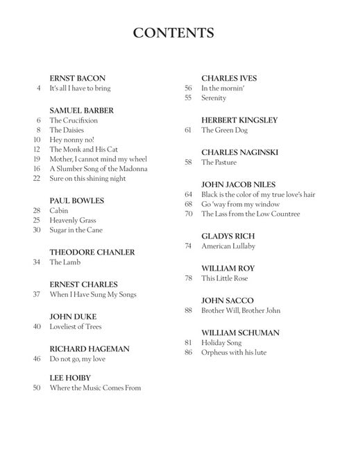 Selected art songs by prominent American composers in the G. Schirmer and AMP catalog, including songs by Samuel Barber, John Duke, Lee Hoiby, Charles Ives, John Jacob Niles, William Schuman, and others. Includes works from Ernst Bacon: It's all I have to bring · Samuel Barber: The Crucifixion; The Daisies; Hey nonny no!; The Monk and His Cat; Mother, I cannot mind my wheel; A Slumber Song of the Madonna; Sure on this shining night · Paul Bowles: Cabin; Heavenly Grass; Sugar in the Cane · Theodore Chanler: The Lamb · Ernest Charles: When I Have Sung My Songs · John Duke: Loveliest of Trees; Richard Hageman: Do not go, my love · Lee Hoiby: Where the Music Comes From · Charles Ives: In the mornin'; Serenity · Herbert Kingsley: The Green Dog · Charles Naginski: The Pasture · John Jacob Niles: Black is the color of my true love's hair; Go 'way from my window; The Lass from the Low Countree · Gladys Rich: American Lullaby · William Roy: This Little Rose · John Sacco: Brother Will, Brother John · William Schuman: Holiday Song; Orpheus with his lute.