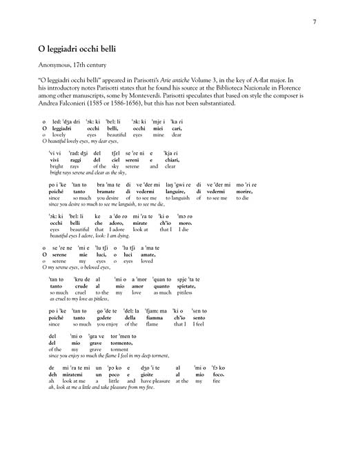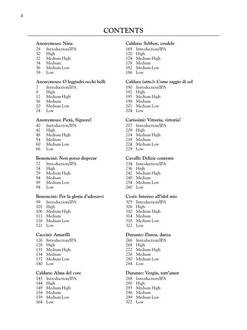 Most voice teachers and singers still prefer the pianistic, wonderfully gratifying editions made by Alessandro Parisotti (1853-1913) of early Italian arias. This newly researched edition, with updated composer attributions, features new, clean music engravings. The collection includes the original contents of 24 Italian Songs and Arias of the Seventeenth and Eighteenth Centuries plus four additional Parisotti editions. Also includes international phonetic alphabet for each song text, word for word translations for study, historical introduction for each aria, and a preface on Parisotti and his approach to this music. This compilation includes the High, Medium High, Medium, Medium Low, and Low editions in one book, perfect for teacher reference. The Complete set is comparable to a retail price of $49.95 if components are bought separately. Contents: ANONYMOUS: Nina · O leggiadri occhi belli · Pieta, Signore! · BONONCINI: Non posso disperar · Per la gloria d'adorarvi · CACCINI: Amarilli · CALDARA: Alma del core · Sebben, crudele · Come raggio di sol · CARISSIMI: Vittoria, vittoria! · CAVALLI: Delizie contente · CESTI: Intorno all'idol mio · DURANTE: Danza, danza · Vergin, tutt'amor · GIORDANI: Caro mio ben · GLUCK: O del mio dolce ardor · LEGRENZI: Che fiero costume · LOTTI: Pur dicesti, o bocca bella · MARCELLO: Quella fiamma che m'accende · MONTEVERDI: Lasciatemi morire! · PAISIELLO: Nel cor piu non mi sento · PARISOTTI: Se tu m'ami · A SCARLATTI: Gia il sole dal Gange · Le violette · O cessate di piagarmi · Se Florindo e fedele · Sento nel core · TORELLI: Tu lo sai