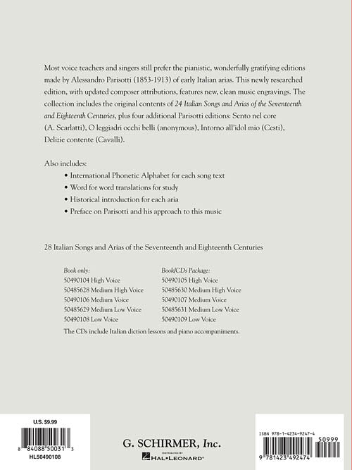 3 new keys. Now available in 5 keys Newly researched and engraved collections, including the original Schirmer 24 plus four additional songs. With International Phonetic Alphabet, word for word translations, and historical information on each song and composer. CDs feature accompaniments and recorded diction lessons. Contents: ANONYMOUS: Nina · O leggiadri occhi belli · Pieta, Signore! · BONONCINI: Non posso disperar · Per la gloria d'adorarvi · CACCINI: Amarilli · CALDARA: Alma del core · Sebben, crudele · Come raggio di sol · CARISSIMI: Vittoria, vittoria! · CAVALLI: Delizie contente · CESTI: Intorno all'idol mio · DURANTE: Danza, danza · Vergin, tutt'amor · GIORDANI: Caro mio ben · GLUCK: O del mio dolce ardor · LEGRENZI: Che fiero costume · LOTTI: Pur dicesti, o bocca bella · MARCELLO: Quella fiamma che m'accende · MONTEVERDI: Lasciatemi morire! · PAISIELLO: Nel cor piu non mi sento · PARISOTTI: Se tu m'ami · SCARLATTI: Gia il sole dal Gange · Le violetta · O cessate di piagarmi · Se Florindo e fedele · Sento nel core · TORELLI: Tu lo sai