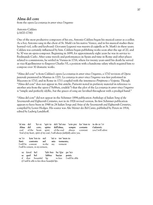 3 new keys. Now available in 5 keys Newly researched and engraved collections, including the original Schirmer 24 plus four additional songs. With International Phonetic Alphabet, word for word translations, and historical information on each song and composer. CDs feature accompaniments and recorded diction lessons. Contents: ANONYMOUS: Nina · O leggiadri occhi belli · Pieta, Signore! · BONONCINI: Non posso disperar · Per la gloria d'adorarvi · CACCINI: Amarilli · CALDARA: Alma del core · Sebben, crudele · Come raggio di sol · CARISSIMI: Vittoria, vittoria! · CAVALLI: Delizie contente · CESTI: Intorno all'idol mio · DURANTE: Danza, danza · Vergin, tutt'amor · GIORDANI: Caro mio ben · GLUCK: O del mio dolce ardor · LEGRENZI: Che fiero costume · LOTTI: Pur dicesti, o bocca bella · MARCELLO: Quella fiamma che m'accende · MONTEVERDI: Lasciatemio morire! · PAISIELLO: Nel cor piu non mi sento · PARISOTTO: Se tu m'ami · A SCARLATTI: Gia il sole dal Gange · Le violette · O cessate di piagarmi · Se Florindo e fedele · Sento nel core · TORELLI: Tu lo sai
