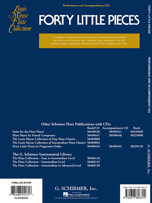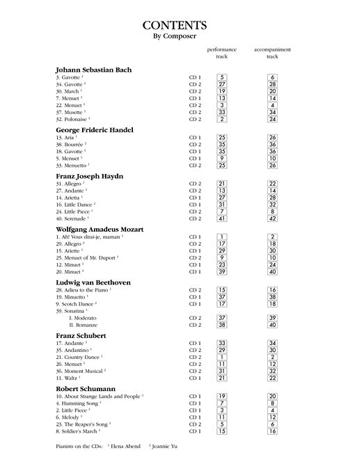 In addition to performance and piano accompaniments playable on both your CD player and computer, these enhanced CDs also include tempo adjustment software for CD-ROM computer use. These CDs work with the book #50329130. Contents include: Gavotte (J.S. Bach) · Bourrée (Handel) · Little Dance (Haydn) · Ah! Vous dirai-je maman (Mozart) · Scotch Dance (Beethoven) · Moment Musical (Schubert) · The Reaper's Song (Schumann) · and more.