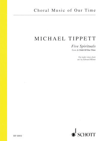 Five Spirituals, the original world-famous Spirituals set by Tippett in his best loved work A Child Of Our Time, newly arranged for male voice choir by one of the leading British conductors in this field. Steal Away · Nobody Knows · Go down, Moses · By and By · Deep River