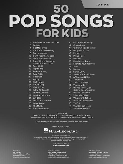 When kids learn to play an instrument, they want to play the songs they know and love! This collection of 50 songs allows them to do just that! It includes 50 contemporary favorites, including: Believer · Don't Stop Believin' · Happy · High Hopes · Let's Get It Started · Ocean Eyes · Perfect · Rewrite the Stars · A Thousand Miles · You Will Be Found · and more.