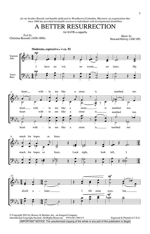 Constructed primarily in homophonic form, this setting of the Rossetti poem results in a poignant plea for resurrected life and spirit. Composer Helvey has dedicated this anthem to Woodhaven, a not-for-profit organization that provides community-based supported living services to individuals with developmental disabilities. Duration: 4:40.