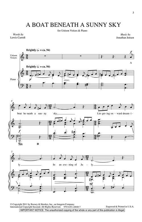 Based on a poem by Lewis Carroll, this charming work for unison treble voices is suitable for even the younger singers. The music captures the essence of the Carroll text, with its sense of innocence and fleeting pleasures of childhood. Excellent selection for school or children's choirs. Duration: 2:20.