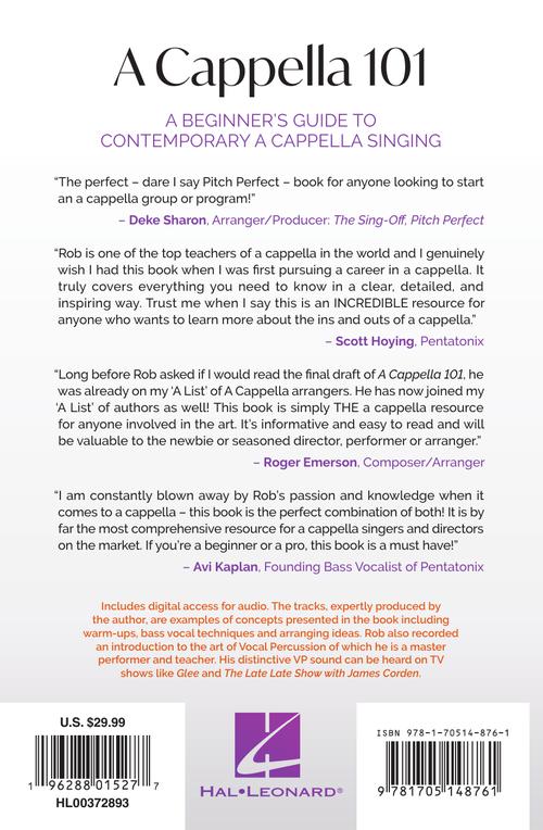 A cappella teacher/performer/producer Rob Dietz expertly describes the nuts, bolts and artistry of creating contemporary a cappella music. Rob is the perfect person to write this text, produce the sample tracks available on line and draw from his vast community of a cappella experts for advice and experiences. Whether you are an a cappella newbie or seasoned expert, this resource is for you! The perfect - dare I say pitch perfect - book for anyone looking to start an a cappella group or program! -Deke Sharon, Arranger/Producer: The Sing-Off, Pitch Perfect Includes digital access for audio. The tracks, expertly produced by the author, are examples of concepts presented in the book including warm-ups, bass vocal techniques, and arranging ideas.