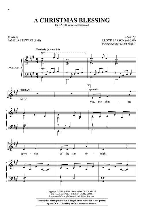 Uses: Benediction, Christmas, Christmas Eve Scripture: II Chronicles 7:14; Matthew 2:10; Luke 2:14 This anthem will supply a tender and intimate moment to close your Christmas concerts and services. Written in the style of a traditional benediction, the text is lifted gently on the wings of a tuneful theme and supported by sensitive piano writing. The appearance of Silent Night is a perfect exclamation point to this charming original song and provides the option of congregational participation. Perfect for Christmas Eve!