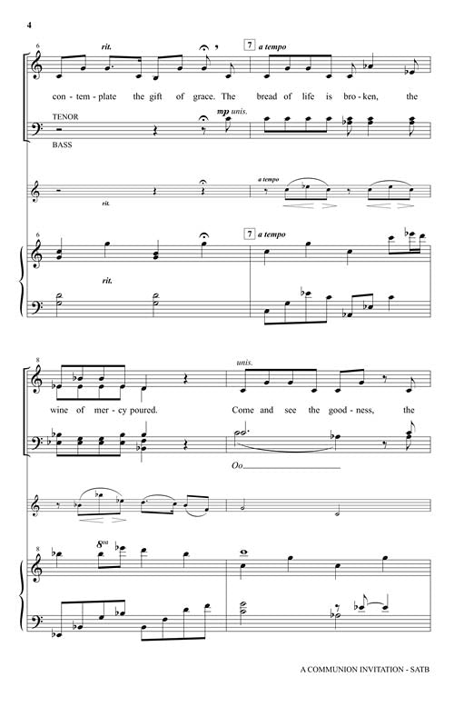 Uses: Communion Scripture: Ephesians 2:5; Matthew 26:28 The table of Christ beckons us to gather and receive the blessing of grace in this atmospheric new offering. The haunting violin obbligato rises like a prayer above the composers' arching theme and adds a bittersweet touch to this brief, but effective, sacred song. Touching! Duration: ca. 2:14