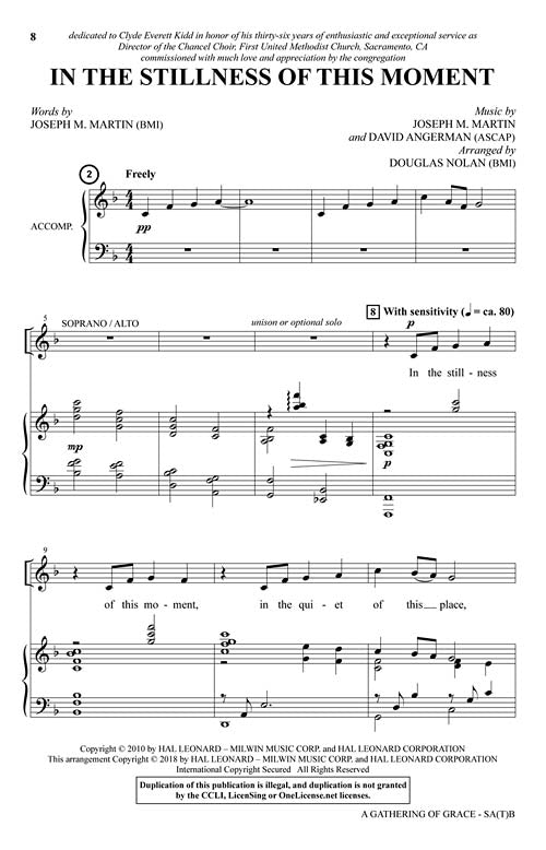 Written to commemorate the Passion of Christ, this cantata is a moving tribute to His life and ministry. Composed for maximum flexibility and scored for SA(T)B voices, the optional cued notes make it possible for the cantata to grow with your choir. Smaller choirs will enjoy the rich textures and larger ensembles will be able to engage their full resources. For churches that desire an instrumental component, a very modest consort instrumentation creates a reverent accompaniment. The narration contains scriptures and prayers to convey the graceful theme of Christ's sacrificial love. Ending with the crucifixion, A Gathering of Grace will set the stage for Easter morning. Songs include: Prelude of Shadows; In the Stillness of This Moment; Ask of Me; Palm Branches; A Light in the Upper Room; Jesus, in Gethsemane; The Day the Cross Held Up the Sky; A Green Hill Far Away; Recessional. Score and Parts (fl, cl, hn, perc, pno, hp, vn, vc) available as a Printed Edition and as a digital download.