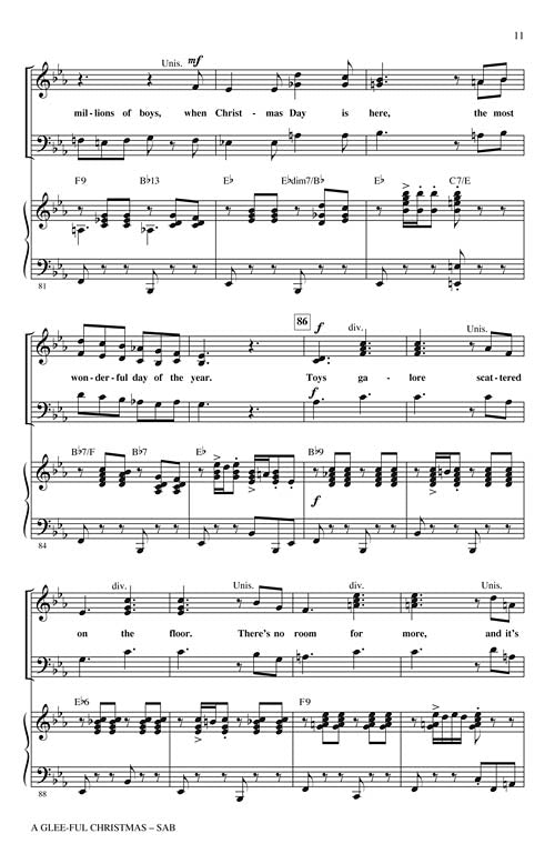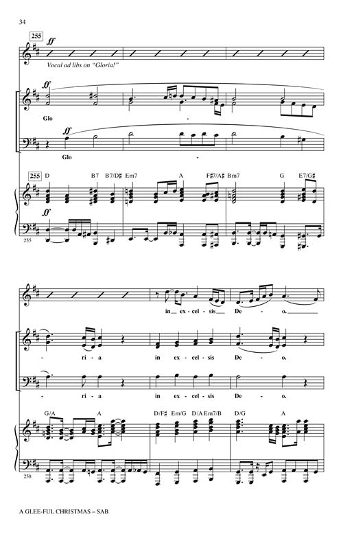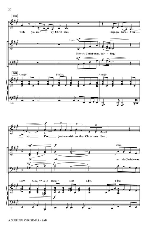 Join the cast of Glee as they spread Christmas cheer with dazzling renditions of these holiday classics in a 10-minute medley that will add sparkle to every December concert! Includes: The Most Wonderful Day of the Year; Merry Christmas, Darling; Jingle Bells; Angels We Have Heard on High. Available separately: SATB, SAB, SSA, ShowTrax CD. Combo parts available as a digital download (tpt 1-2, tsx/fl, cl, tbn, bsx/bcl, syn, gtr, b dm). Duration: ca. 9:35 (ca. 6:45 with opt. ending).