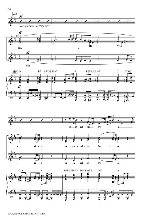 Join the cast of Glee as they spread Christmas cheer with dazzling renditions of these holiday classics in a 10-minute medley that will add sparkle to every December concert! Includes: The Most Wonderful Day of the Year; Merry Christmas, Darling; Jingle Bells; Angels We Have Heard on High. Available separately: SATB, SAB, SSA, ShowTrax CD. Combo parts available as a digital download (tpt 1-2, tsx/fl, cl, tbn, bsx/bcl, syn, gtr, b dm). Duration: ca. 9:35 (ca. 6:45 with opt. ending).