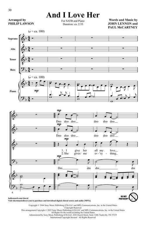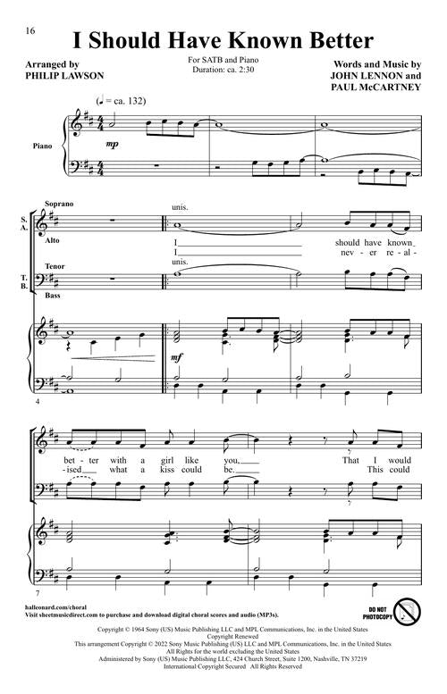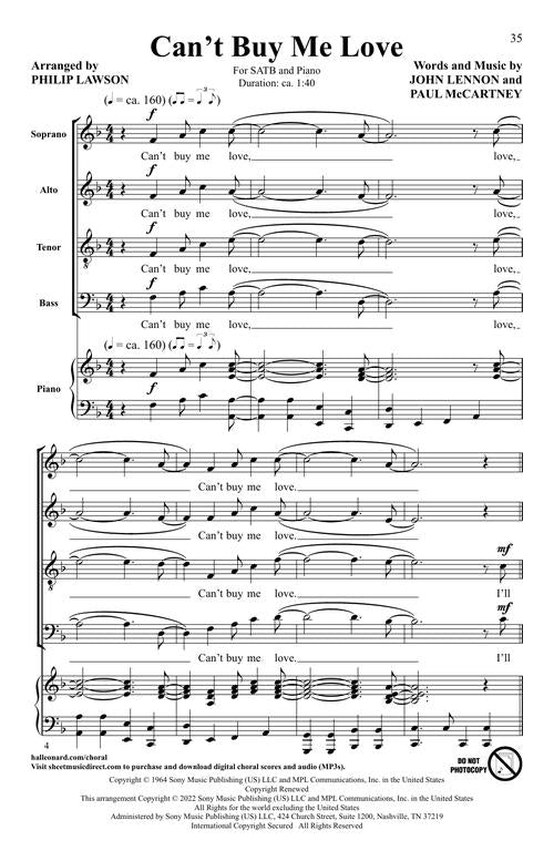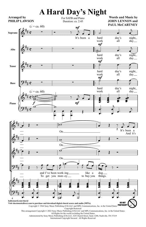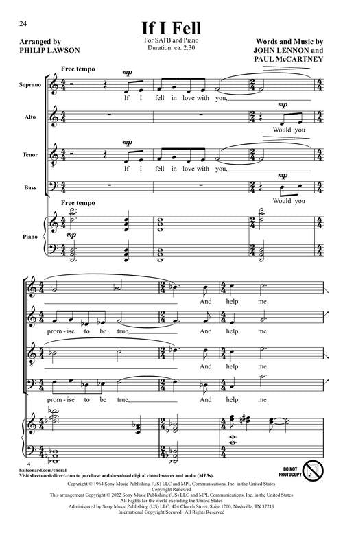 Five songs from the album 'A Hard Day's Night' arranged by Philip Lawson. These simple arrangements are easy to learn and fun to sing for all choirs. Includes: And I Love Her, Can't Buy Me Love, A Hard Day's Night, I Should Have Known Better and If I Fell.