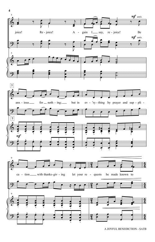 Uses: Benediction Scripture: Philippians 4:4, 6-7 A charming conclusion to any worship gathering, this brief but effective Scripture setting reminds us of the joy and the peace that is ours in Christ. These two emotions inform the musical treatment of the anthem moving it from celebration to a reflective contrapuntal Amen. Perform it with the organ for a lovely impact. Duration: ca. 1:50.