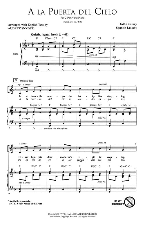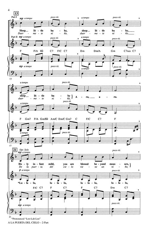 A charming setting of a traditional Spanish carol will provide a tender, lyrical moment in your concert. Very accessible, this work is an excellent selection for younger or developing choirs. Available separately: SATB, 3-Part Mixed, 2-Part. Duration: ca. 2:20.