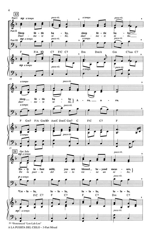 A charming setting of a traditional Spanish carol will provide a tender, lyrical moment in your concert. Very accessible, this work is an excellent selection for younger or developing choirs. Available separately: SATB, 3-Part Mixed, 2-Part. Duration: ca. 2:20.
