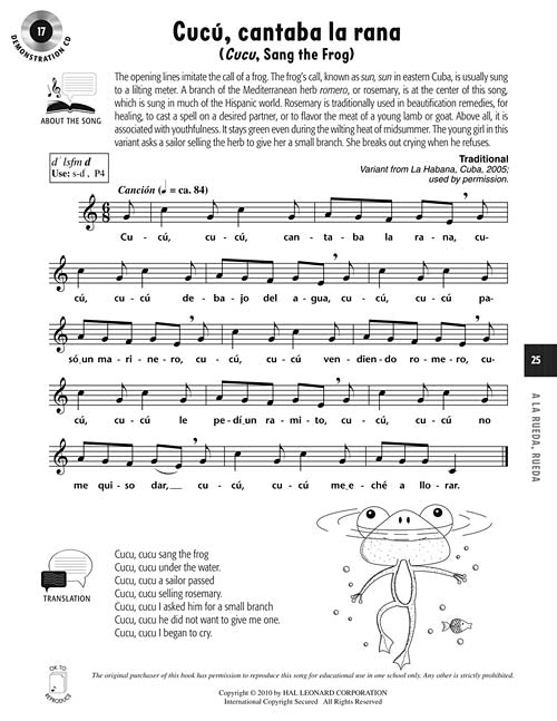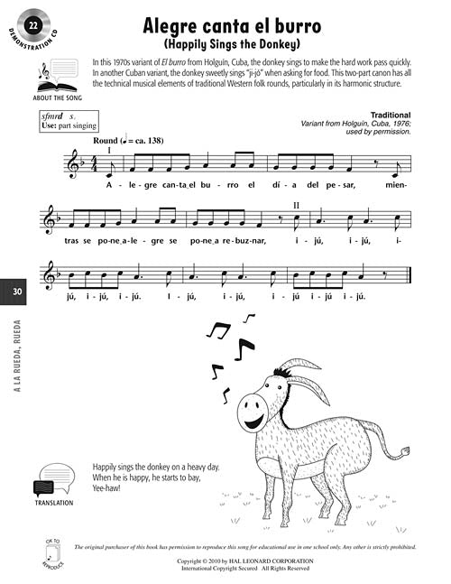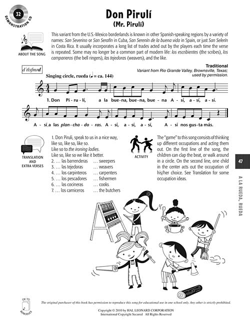 Singing songs and playing games are a fundamental part of a child's life, no matter where we live or what language we speak. Experience Hispanic-American heritage and traditions with this well-crafted collection of children's folksongs. Playfully illustrated with original Uruguayan art, this collection of thirty-four songs for early childhood through the elementary grades features page-after-page of reproducible, singable melodies and game instructions, with their cultural background. Both authors are of Cuban origin and have collected songs that will appeal to a wide audience, whether or not you can read music, speak Spanish, or in the case of small children, read at all. English translations, a pronunciation guide, and curricular indices are also included. The enclosed CD provides quality demonstration recordings of children singing the songs unaccompanied, as they are traditionally performed. Perfect for school or home, this collection provides parents and teachers with all the necessary tools for teaching the basic elements of music and Hispanic culture, which will be fun for children today and for generations to come. Available in Book/CD format. Suggested for PreK-Gr.6.