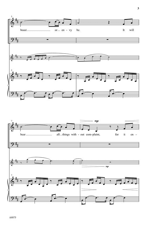Uses: General, weddings Scripture: I Corinthians 13 Wafting like a prayer, this testament to the power of love is an unforgettable selection for weddings or general worship needs. There is a folk-like charm that surrounds this selection and the theme will remain with you long after the echoes have faded away. The optional violin or C-instrument obbligato further enhances this authentic spirit. A song for the soul!