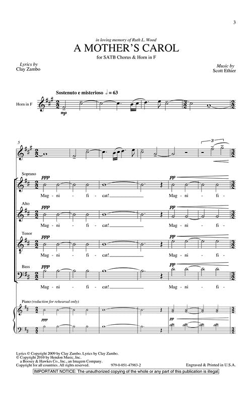 Poet Clay Zambo describes the text to A Mother's Carol as an utterly human perspective of the Christmas story. Scott Ethier's treatment of this text for SATB chorus and French horn is stunning and emotionally poignant. As Mary accepted her challenge and duty in life, so also are we asked to do the same - May peace be born through me today. Duration: 3:45.