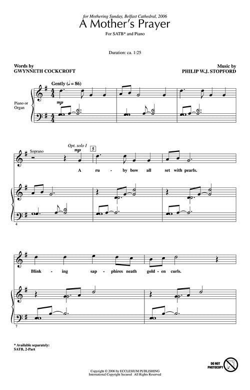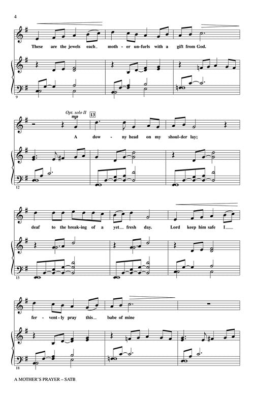 The saplings grow through summer from spring. My love gave them roots and now gives them wings. The warm text enhances the beautiful music of this touching anthem that is a wonderful choice for Mothers Day and other special tributes. Available separately: SATB, SSA. Duration: ca. 1:25