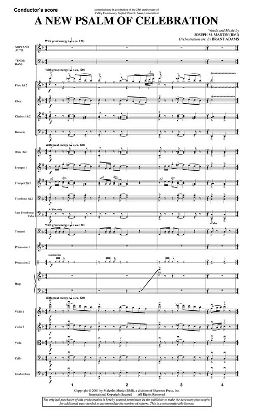 Uses: General, concert Scriptures: Isaiah 7:14; Matthew 1:8-25 A fantastic acclamation of praise filled with rhythmic drive and festive spirit. This call to celebrative worship can be a theme song for your choir as it affirms its ministry through the gift of music. The mixed-meter joy of the opening theme gives way to a more lyric middle section before returning to the commanding sweep of the opening theme. Score & Parts for Flt 1&2, Oboe, Clt 1&2, Bassoon, Horn 1&2, Tpt 1, Tpt 2&3, Tbone 1&2, Bass Tbone/Tuba, Timp, Perc 1&2, Harp, Violin 1, Violin 2, Viola, Cello, Double Bass.