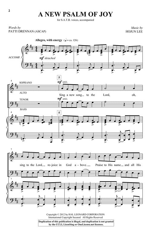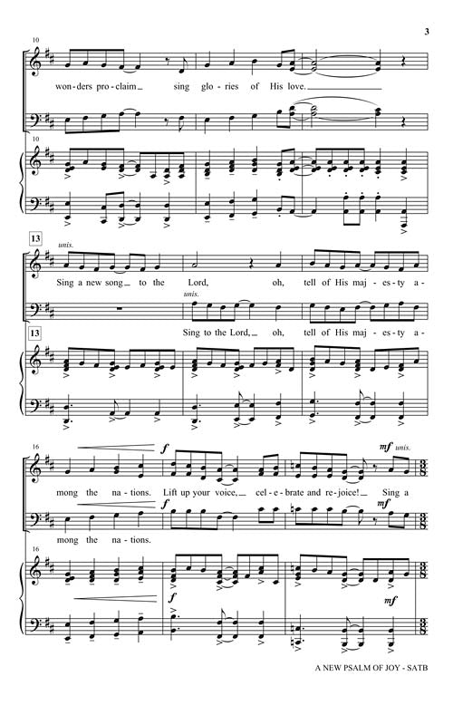 Uses: General, Youth Choir, Concert Scripture: Psalm 96:1-5; Isaiah 42:10 Unbridled praise breaks forth in this festive contemporary choral based on the Psalms. Syncopations and mixed meter animate the primary theme with an enthusiastic spirit admonishing the faithful to Sing to the Lord a new song! A lovely contrasting middle section provides musical and lyrical variety before launching into an exciting recapitulation. The final drive to the end is a perfect punctuation mark to this call to joyful praise. Duration: ca. 2:57.