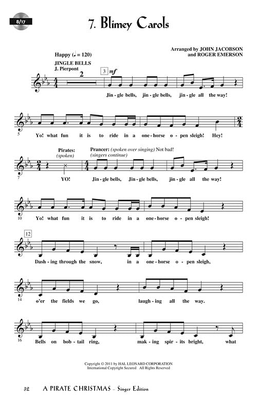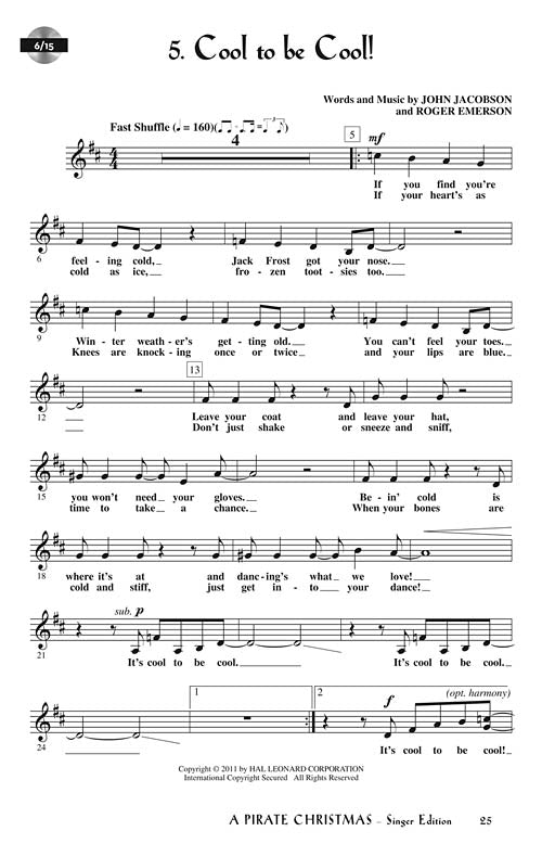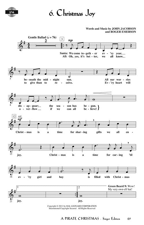 Christmas is approaching, and the elves are exhausted and tired of the cold! A few days of R and R in the warm island sun is just what they need ... snorkeling, collecting seashells, building sand castles, catching a wave behind that huge pirate ship . . . What? Pirates?!! ARRRR!! Ahoy, mates! Get ready for one mighty adventure when the legendary White Beard (aka Santa) and the elves teach a salty crew of colorful scallywags all about true treasure. Upper elementary and middle school performers will have a rollicking good time with this 35-minute holiday spectacular that features eight original songs for unison voices and a script with over 75 speaking parts easily adapted to casts of varying sizes. The Teacher Edition also includes choreography, helpful production guide and teaching objectives linked to the National Standards for each song. Available separately: Teacher Edition, Singer 5-Pak, Preview CD (with vocals), Preview Pak (1 Preview CD, 1 Singer book), Performance/Accompaniment CD, Performance Kit/CD (Teacher, 20 Singer books, Perf/Accom CD). Duration: ca. 35 minutes. Suggested for grades 4-8.